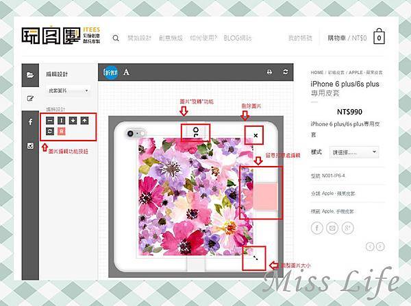 上傳照片後您可以透過功能鍵嘗試各種設計效果,例如:置前、置後、旋轉、刪除圖片、放大縮小等等,您可以不斷重複編輯設計直至完成一個滿意的客製化作品。